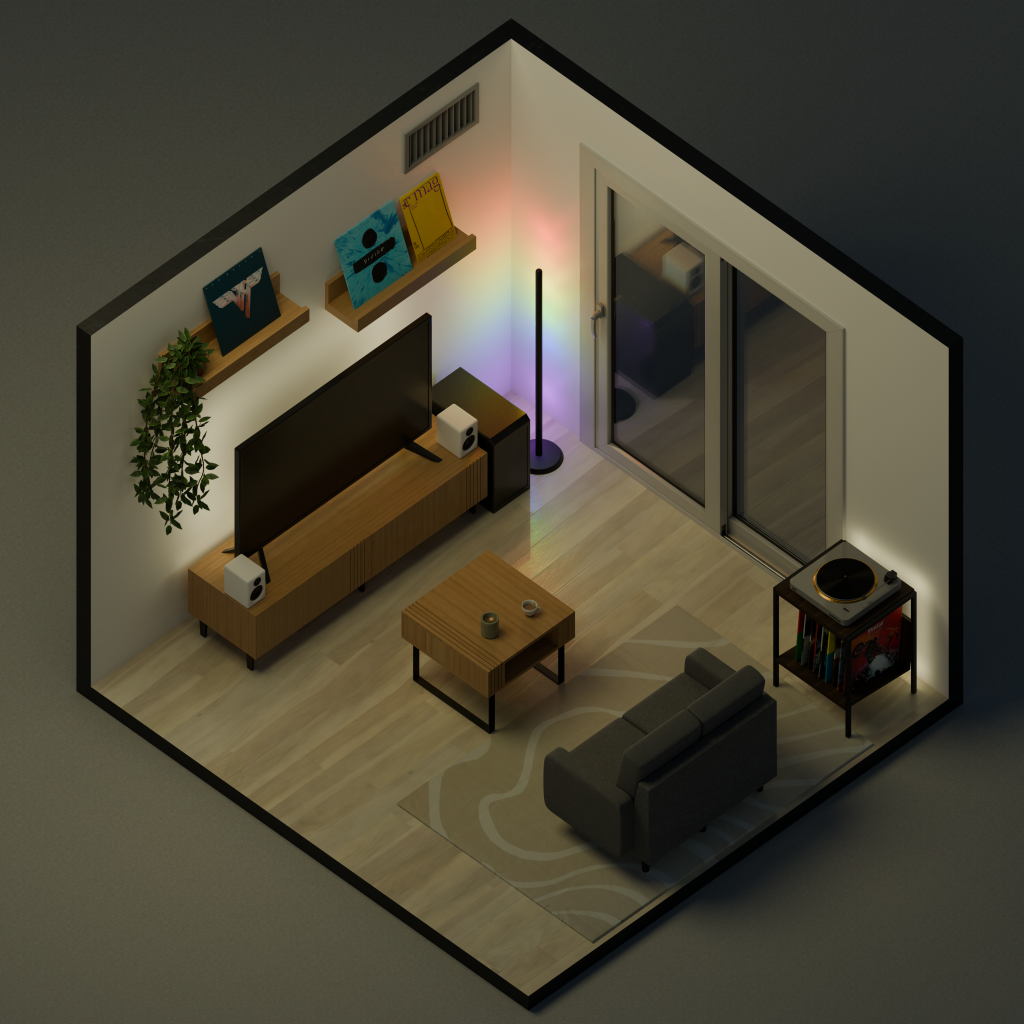 Isometric Interior An isometric scene of an apartment interior. Modeled and rendered in Blender, textured using Adobe Substance Painter.